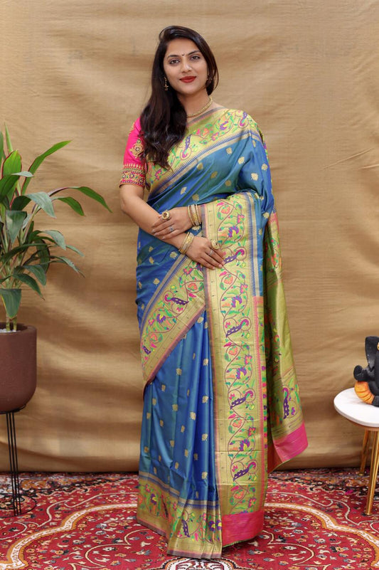 DESCRIPTION Experience the timeless elegance of Paithani Silk Saree with a stunning blouse piece that...
