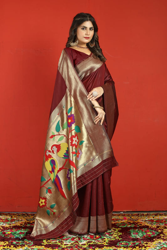 DESCRIPTION Make a statement in this sparkling Paithani silk saree with a sophisticated design elevating...