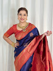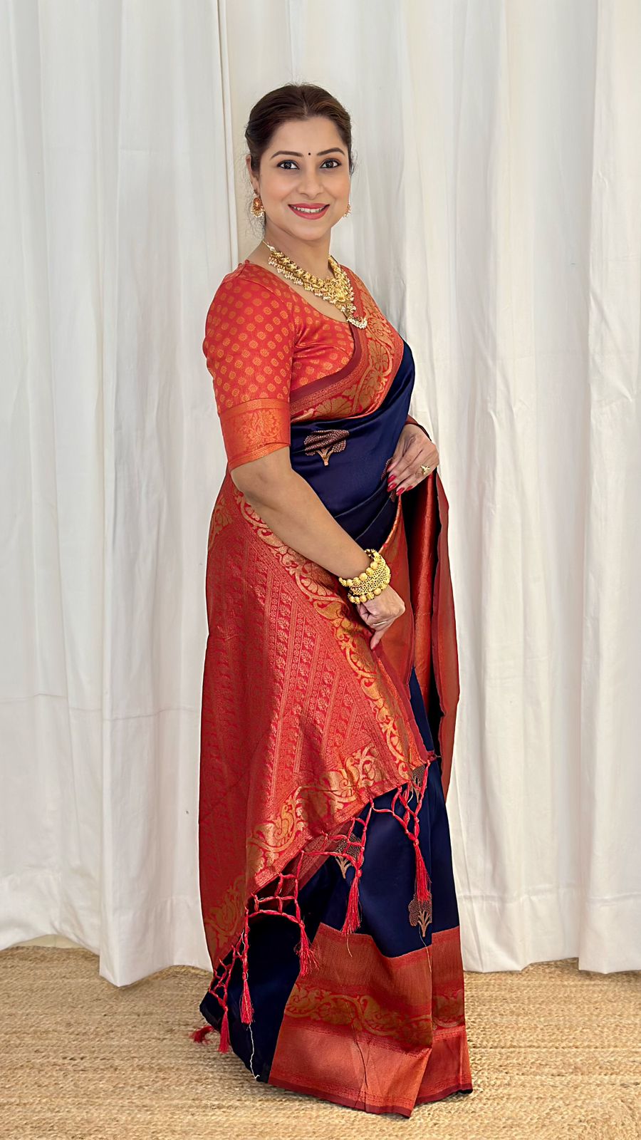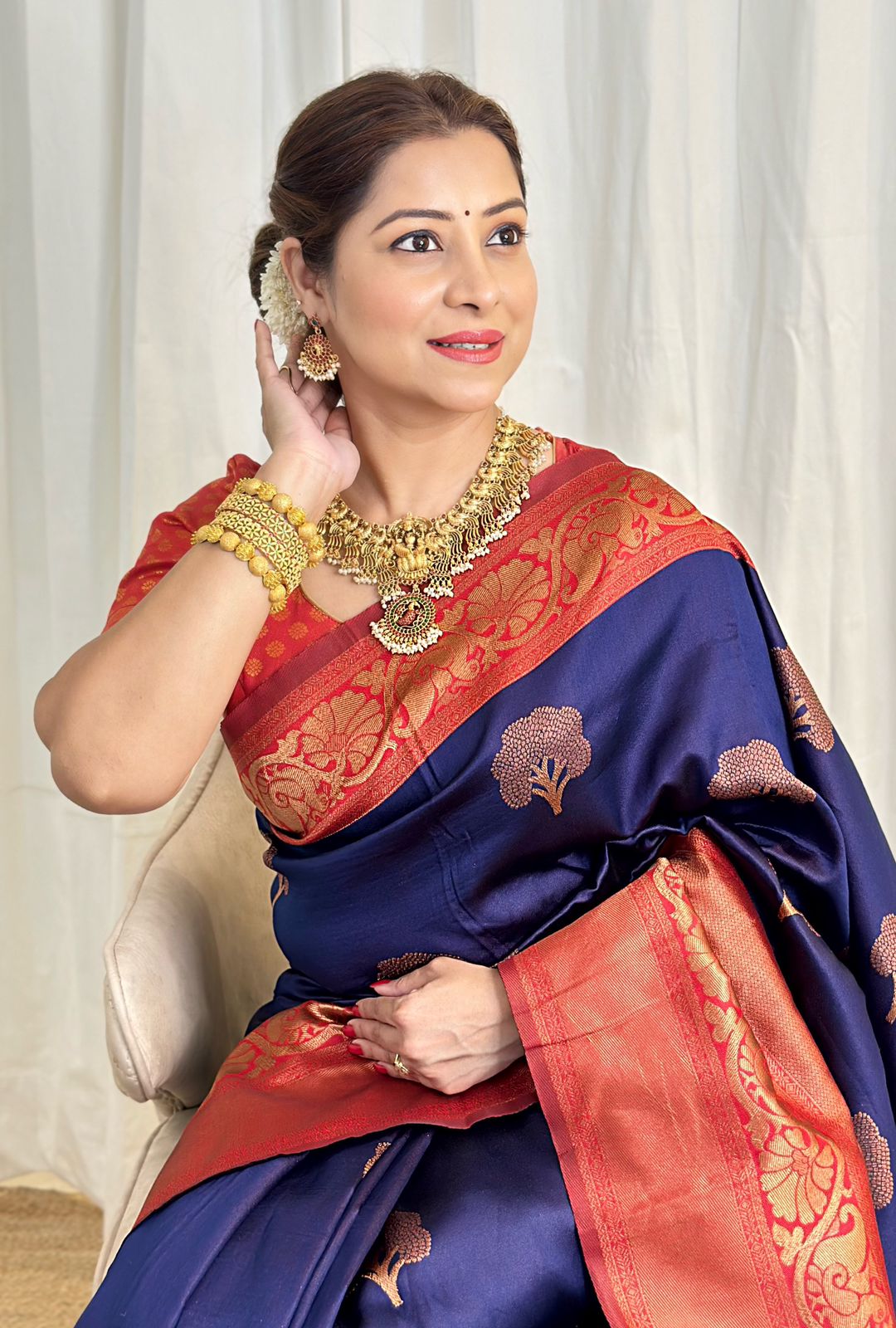 Glorious Navy Blue Soft Banarasi Silk Saree With Groovy Blouse Piece