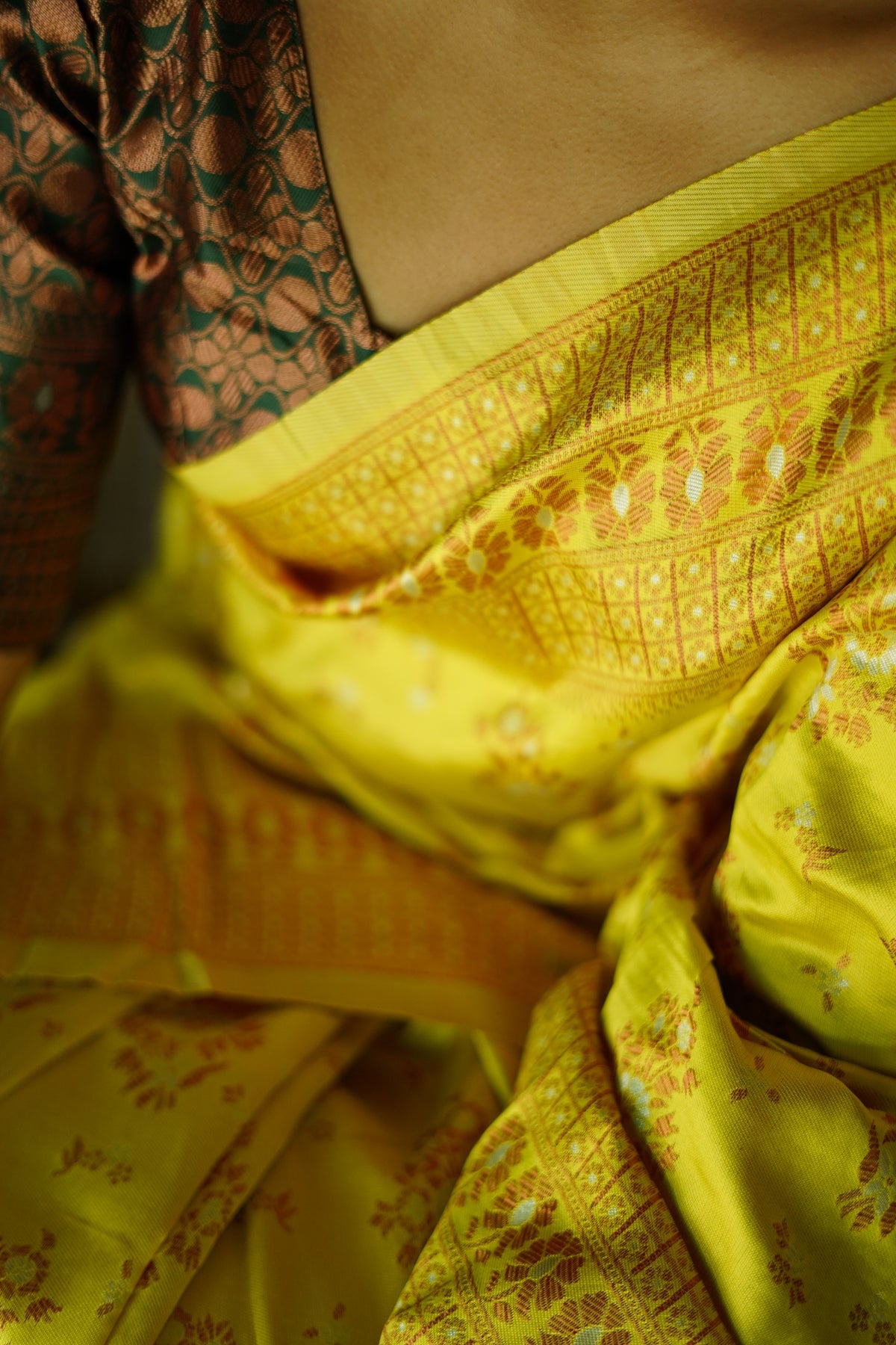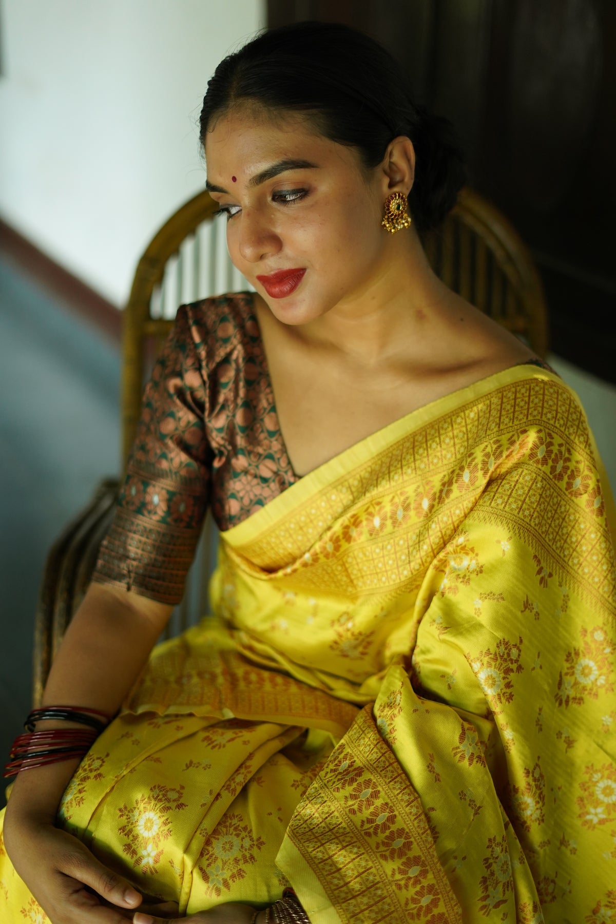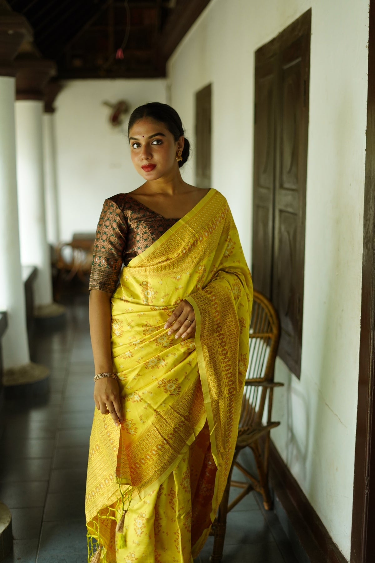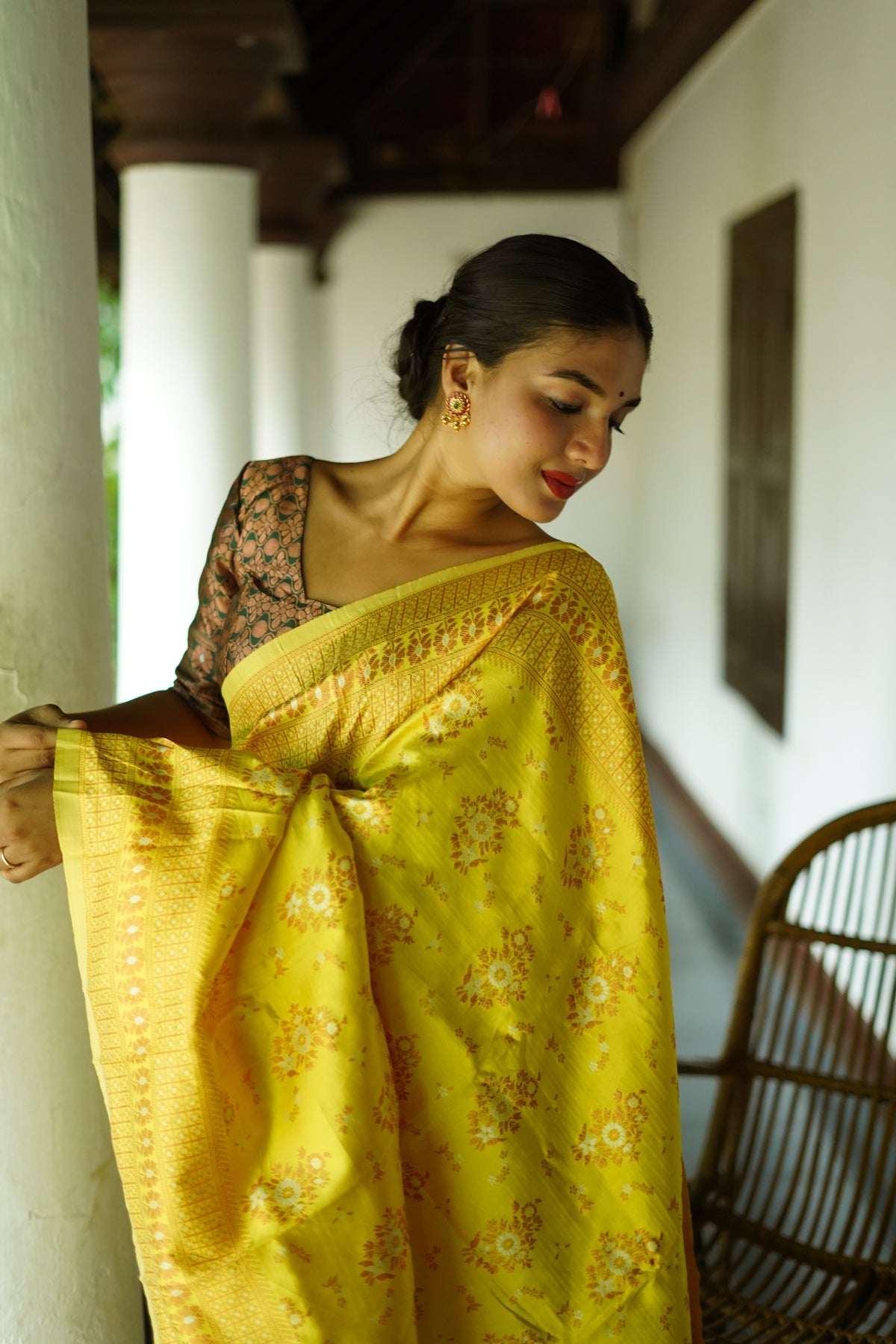 LEMON YELLOW PURE SOFT SILK SAREE WITH TWIRLING BLOUSE PIECE