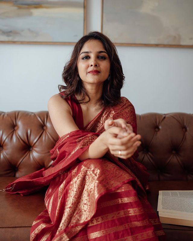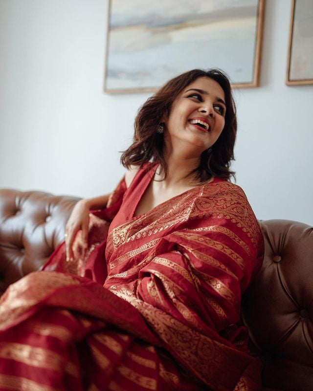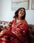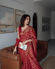 RED PURE BANARASI SILK SAREE WEAVED WITH COPPER ZARI COMES WITH ATTACHED BLOUSE.