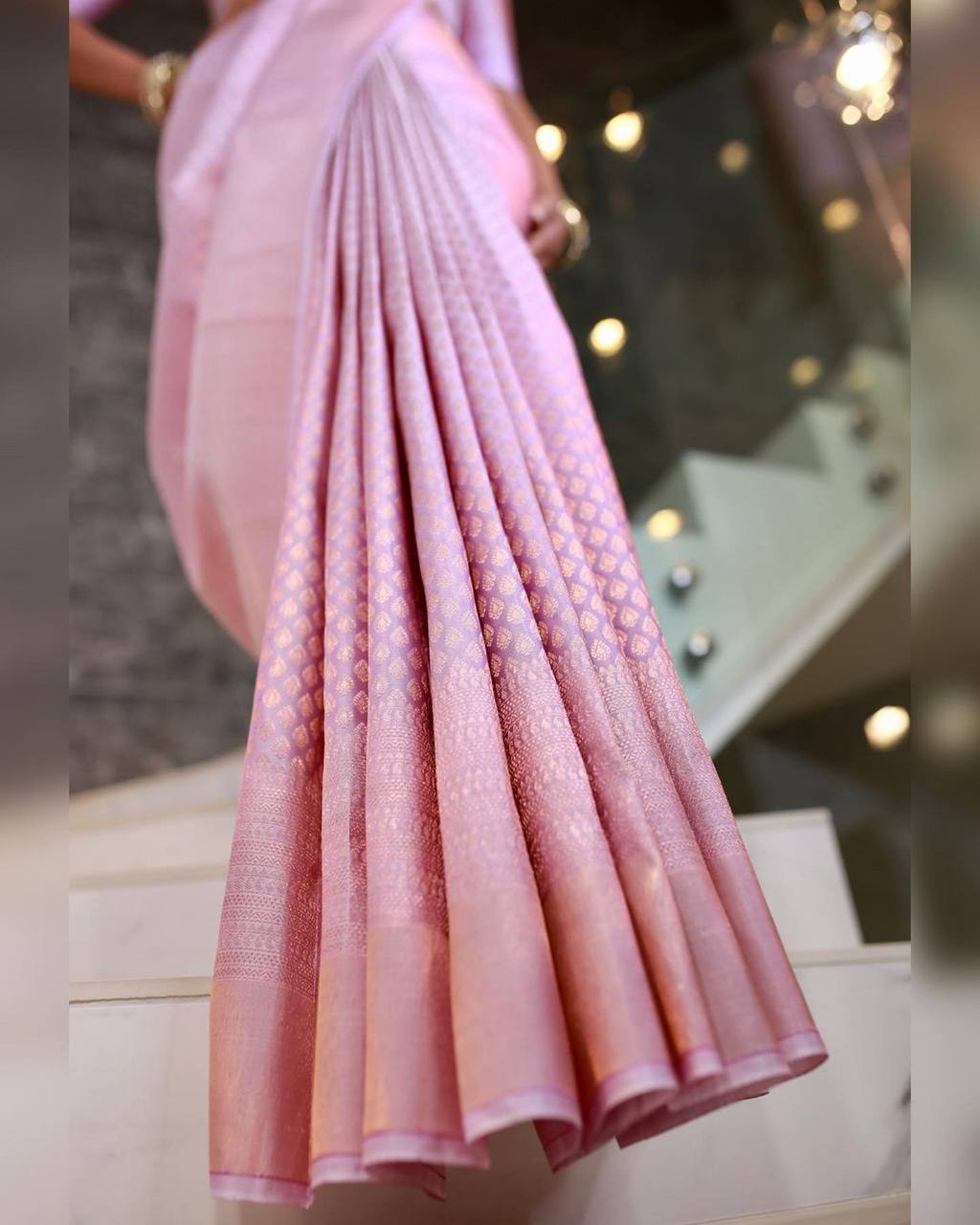 STUNNING BABY PINK SEMI SILK SAREE WEAVED WITH GOLDEN ZARI COMES WITH HEAVY BROCADE BLOUSE.
