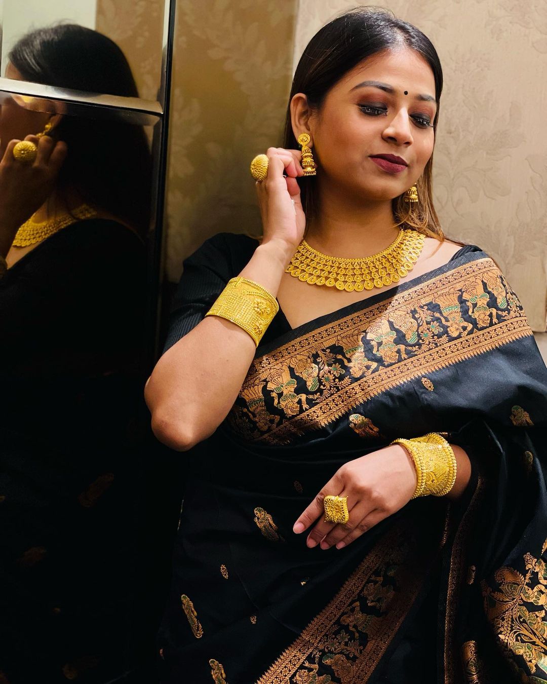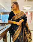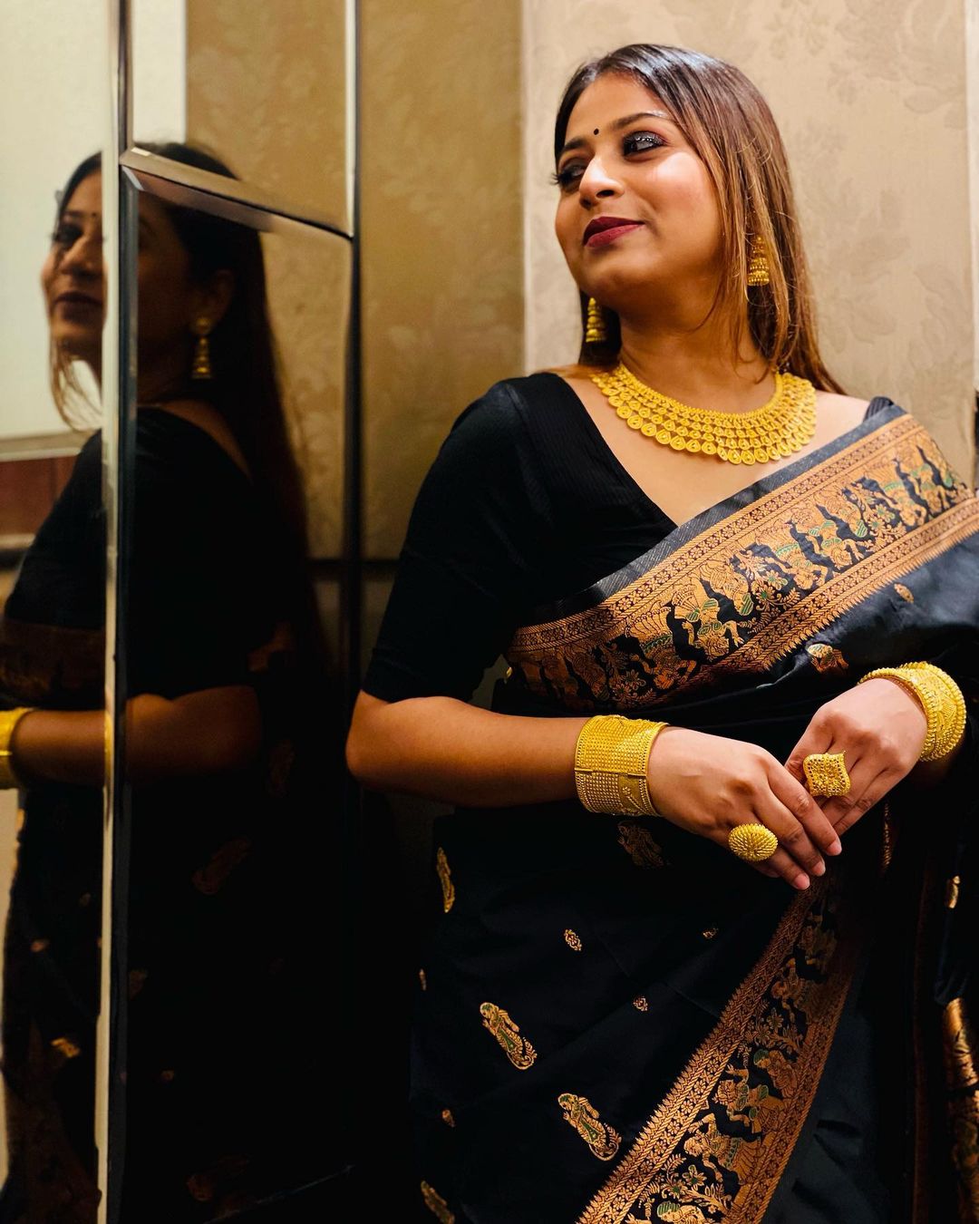 SYMMETRICAL BLACK PURE SOFT SILK SAREE WITH ENGROSSING BLOUSE PIECE