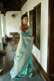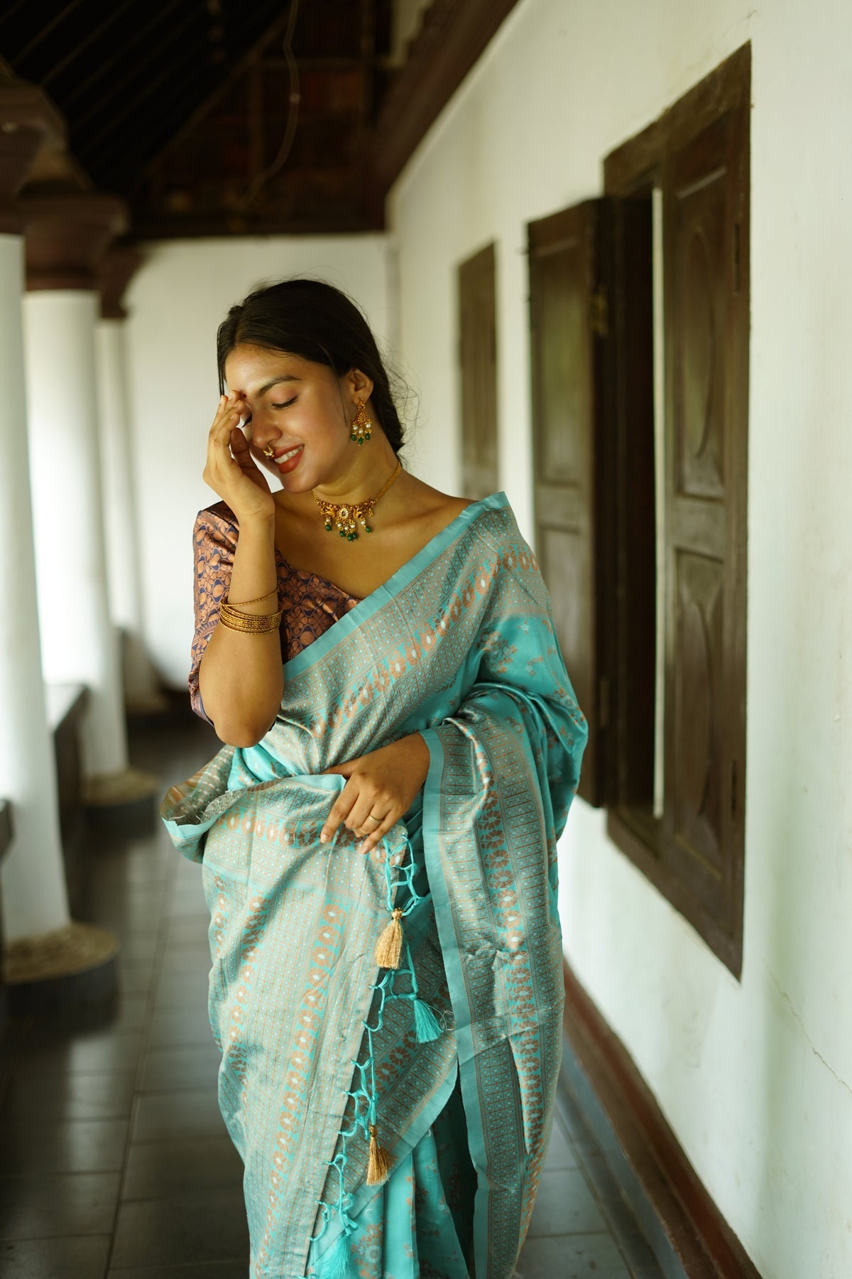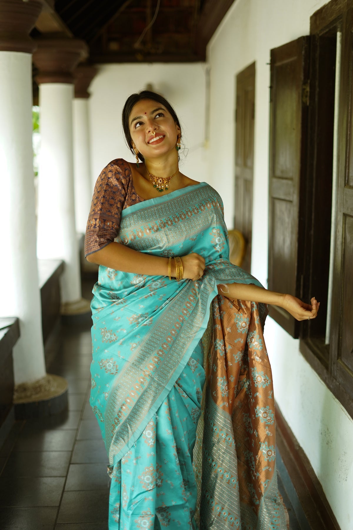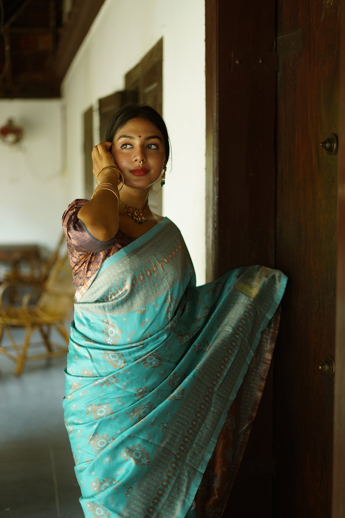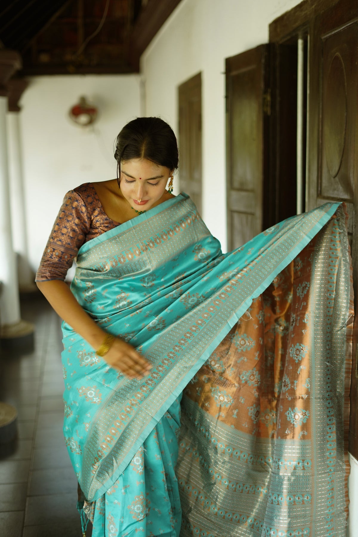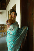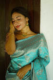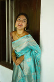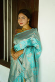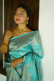 TURQUOISE PURE SOFT SILK SAREE WITH TWIRLING BLOUSE PIECE
