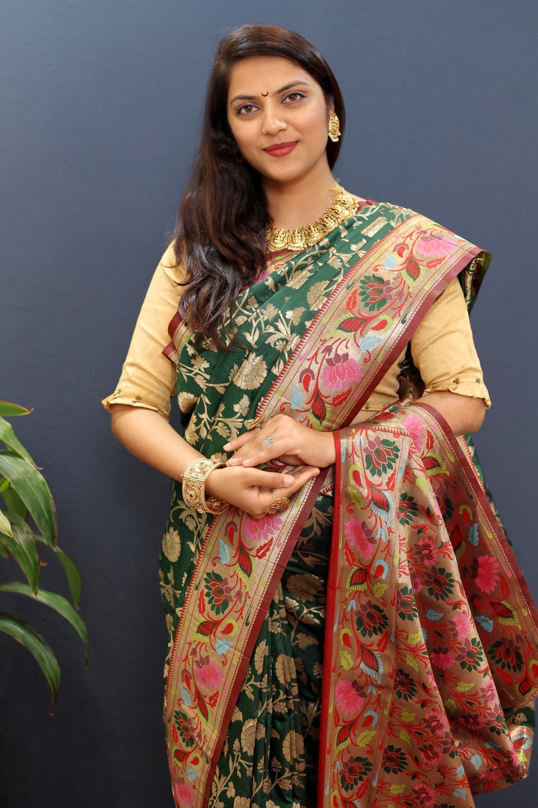 Vestigial Dark Green Paithani Silk Saree With Seraphic Blouse Piece